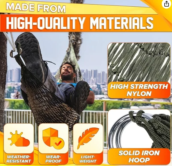 ହାଇଗିଂ ହାମେମକ୍, ଏହି ନାଇଲନ୍ ଷ୍ଟ୍ରିଙ୍ଗ୍ ହାମକ୍ ର ଉଚ୍ଚ ଲୋଡ୍-ବହନକାରୀ କ୍ଷମତା ଅଛି | ଏହି ନାଇଲନ୍ ଦଉଡି ହାମକ୍ ଇନବୋର ଏବଂ ବରିଷ୍ଠତା ହେତୁ ଇଣ୍ଡୋର୍ ଏବଂ ବ ist ୍ଚଳର କାରଣ ଏବଂ ପିନ୍ଧିବା ପାଇଁ ପ୍ରତିରୋଧକାରୀ |