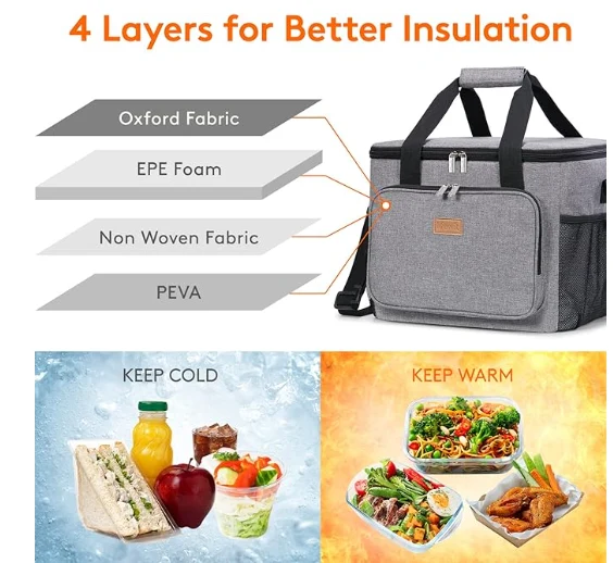 ଇନସୁଲେଟେଡ୍ ପିକନିକ୍ ବ୍ୟାଗ୍, ମଧ୍ୟାହ୍ନ ଭୋଜନ ବ୍ୟାଗ ଇନସୁଲେଟେଡ୍ ସାମଗ୍ରୀରେ ତିଆରି ହୋଇଛି ଯାହା ଖାଦ୍ୟକୁ 5 ଘଣ୍ଟାରୁ ଅଧିକ କିମ୍ବା ଗରମ କରିପାରେ | ଏହା ବ୍ୟତୀତ ଅଙ୍କିତ ଲାଇନ୍ ଖାଦ୍ୟ ଗ୍ରେଡ୍ ପେଭା ଫଏରେ ତିଆରି ହୁଏ ତେଣୁ ତୁମେ ତୁମର ଖାଦ୍ୟକୁ ସିଧାସଳଖ ଚିନ୍ତାରେ ରଖିପାରିବ | ବିଲ୍ଟ-ଇନ୍ 6 ମିମି ଇପେ ଫୋମ୍ ଆପଣଙ୍କ ପାତ୍ର, ଖାଦ୍ୟ ଏବଂ ପାନୀୟ ପାଇଁ ବହୁତ ସୁରକ୍ଷା ପ୍ରଦାନ କରେ |