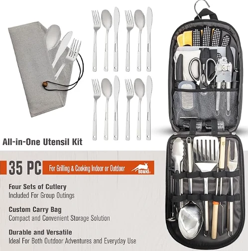ବାହ୍ୟ କ୍ୟାମଟିଂ କୁକର୍ ଷ୍ଟୋରେଜ୍ ବ୍ୟାଗ୍ ଏହି 35 PC କ୍ୟାମ୍ପିଂ ରନ୍ଧନ ବାସନଗୁଡିକ ଆପଣଙ୍କ ବାହାଘର ରନ୍ଧନ ଆବଶ୍ୟକତା ପାଇଁ ସମ୍ପୂର୍ଣ୍ଣ ସମାଧାନ | ଏଥିରେ ଏକ କ୍ୟାମ୍ପିଂ ରୋଷେଇ ଘର ରାନ୍ଧିବା ରାନ୍ଧିବା ସେଟିଂ ଅନ୍ତର୍ଭୁକ୍ତ, ଯାହାକି ଅତିରିକ୍ତ ବିଭାଗ ଏବଂ ଦୁଇଟି ବ୍ୟାକ୍ ପକେଟ୍ ସହିତ ଏକ କଷ୍ଟମ୍ ବ୍ୟାଗରେ ଏକ ସୁନ୍ଦର ପ୍ୟାକ୍ ହୋଇଛି | ସେଟ୍ ତୁମର ସମସ୍ତ ଶିବିର ରନ୍ଧନ ଅତ୍ୟାବଶ୍ୟକ ଉଦ୍ଦେଶ୍ୟରେ କାର୍ଯ୍ୟ କରିବା ପାଇଁ ଡିଜାଇନ୍ ହୋଇଛି, ଏହାକୁ ତୁମର କ୍ୟାମ୍ପିଂ ଗିଅରରେ ଏକ ଅପରିହାର୍ଯ୍ୟ ଯୋଗ କରେ |